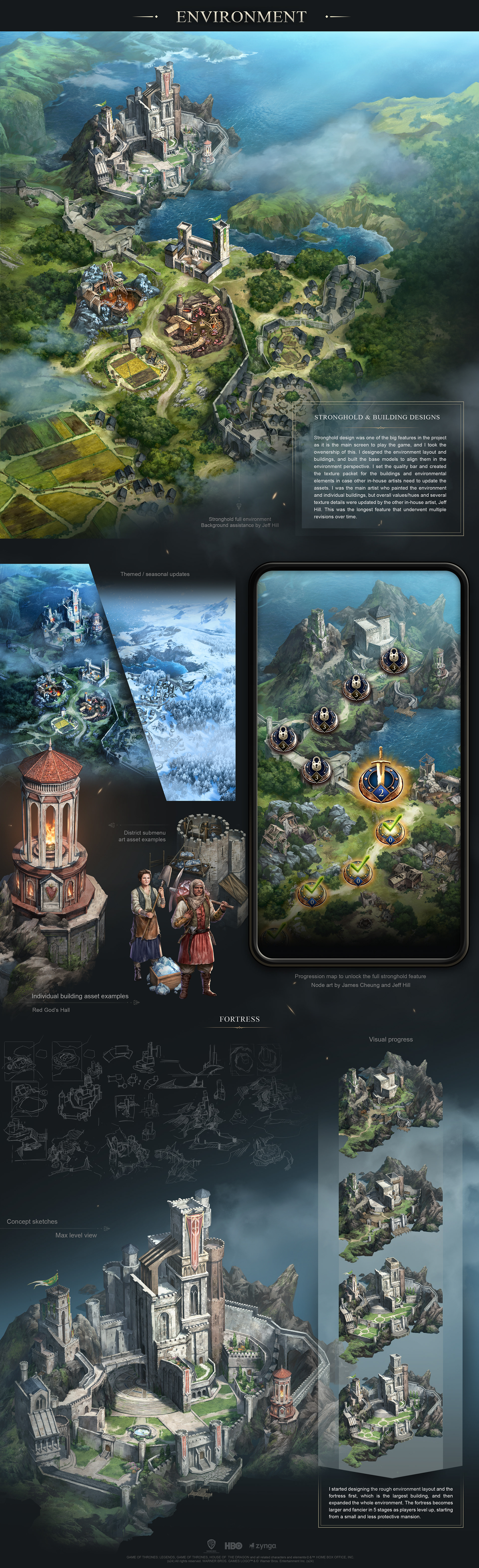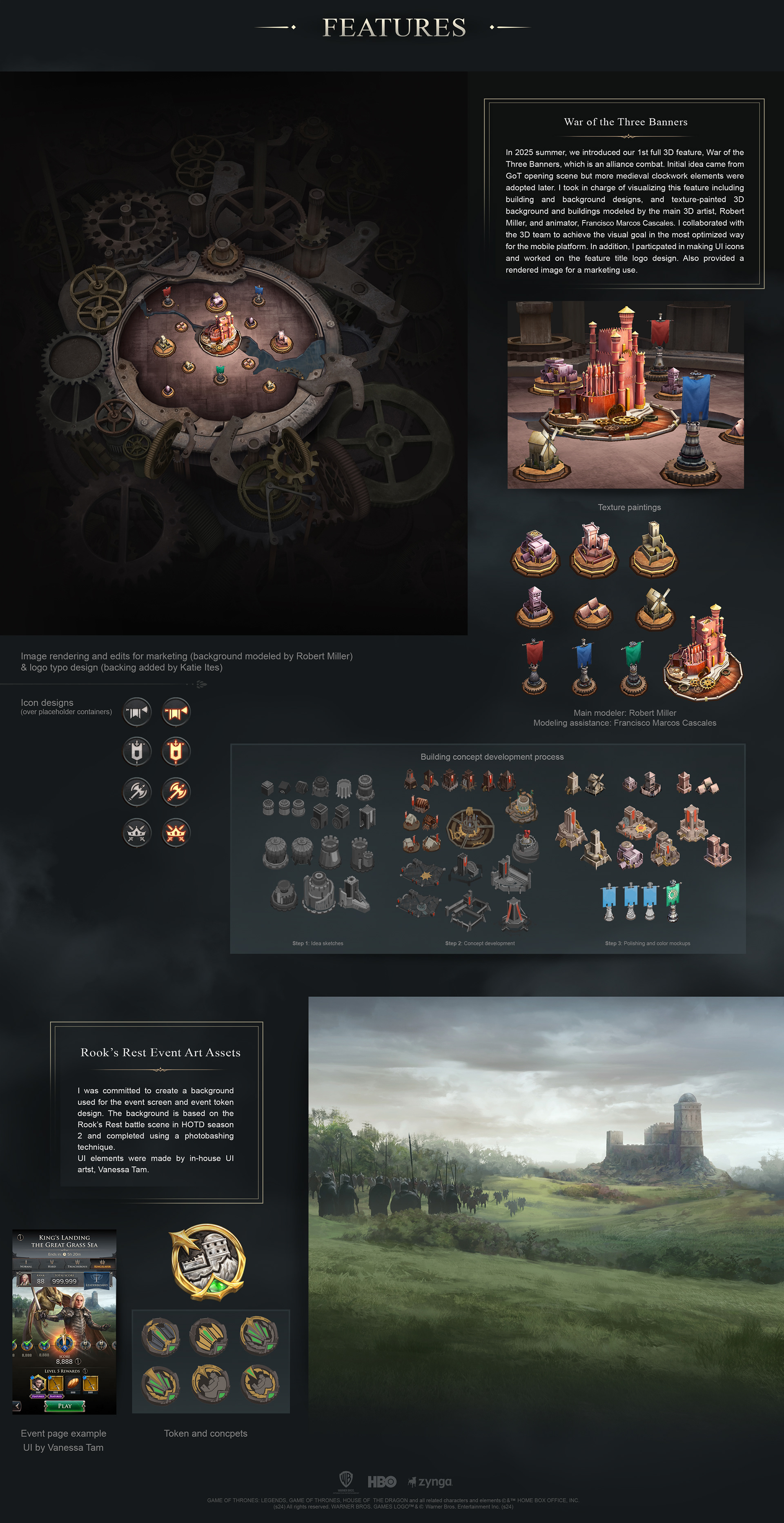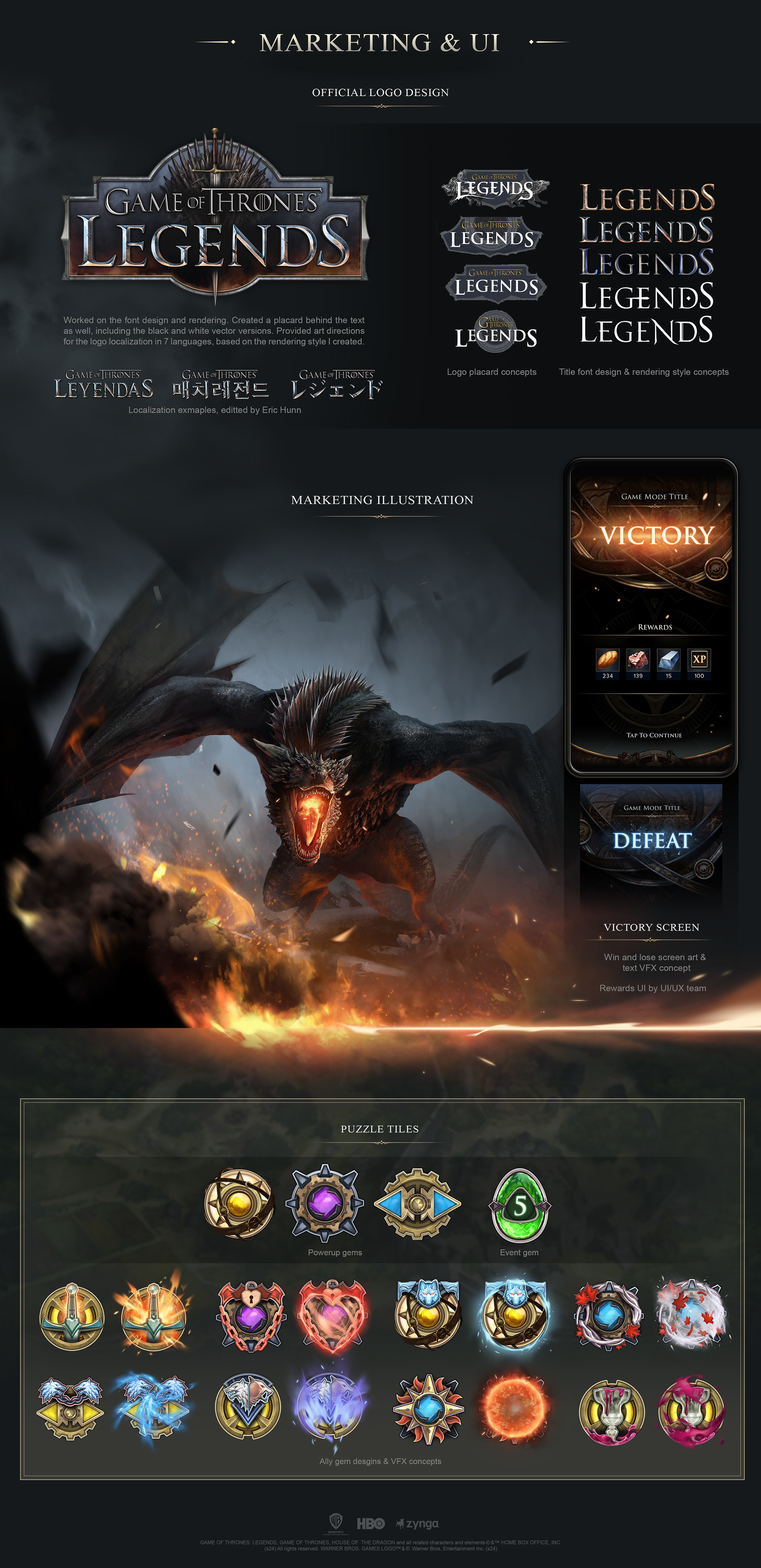 Worked on characters, backgrounds & environment, and 2D VFX mockups. Collaborated with UI team for early UI style explorations and in-game UI art assets. Provided art feedback to OS and animation teams. Texturing support for 3D team. Created official game logo and feature title designs. Logo localization art direction.